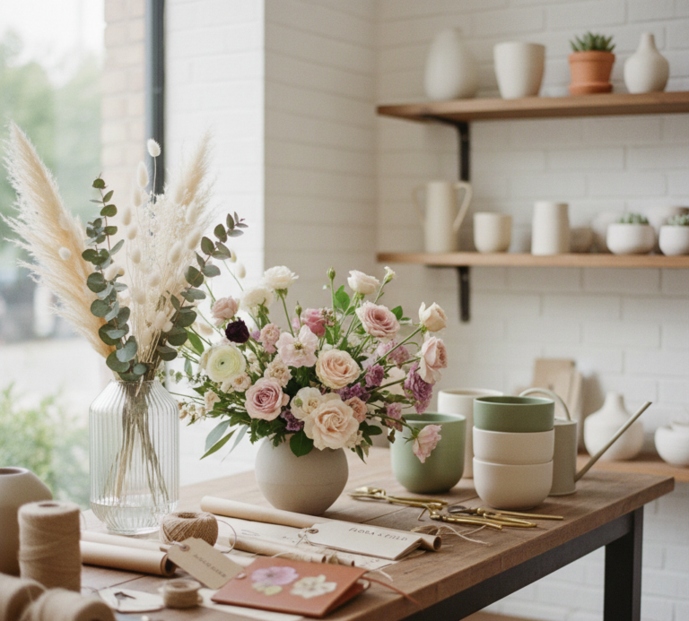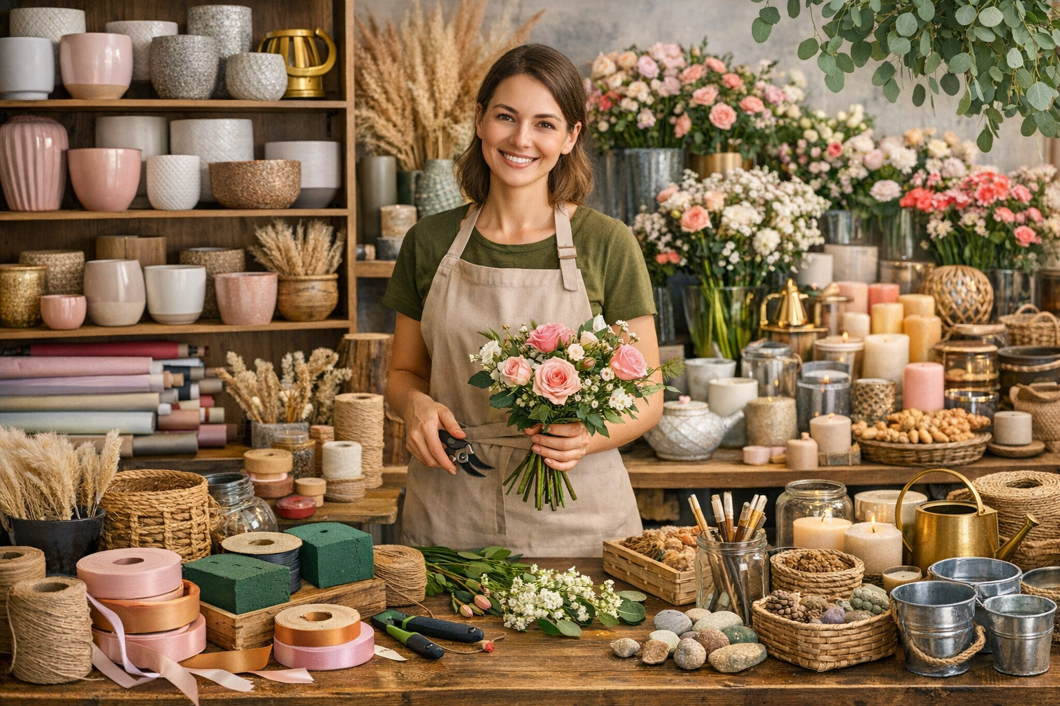 Vasos, recipientes, acessórios de decoração e materiais para arranjos florais.