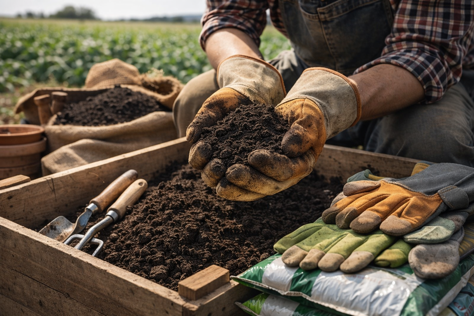 Vasos plásticos, substrato, luvas e artigos para jardinagem e cultivo.